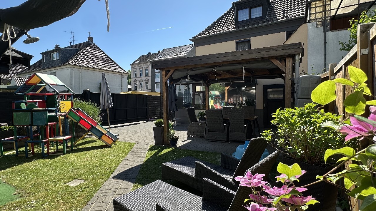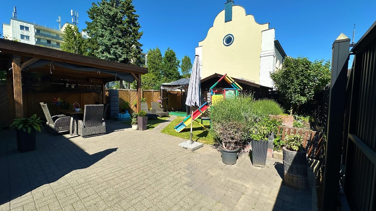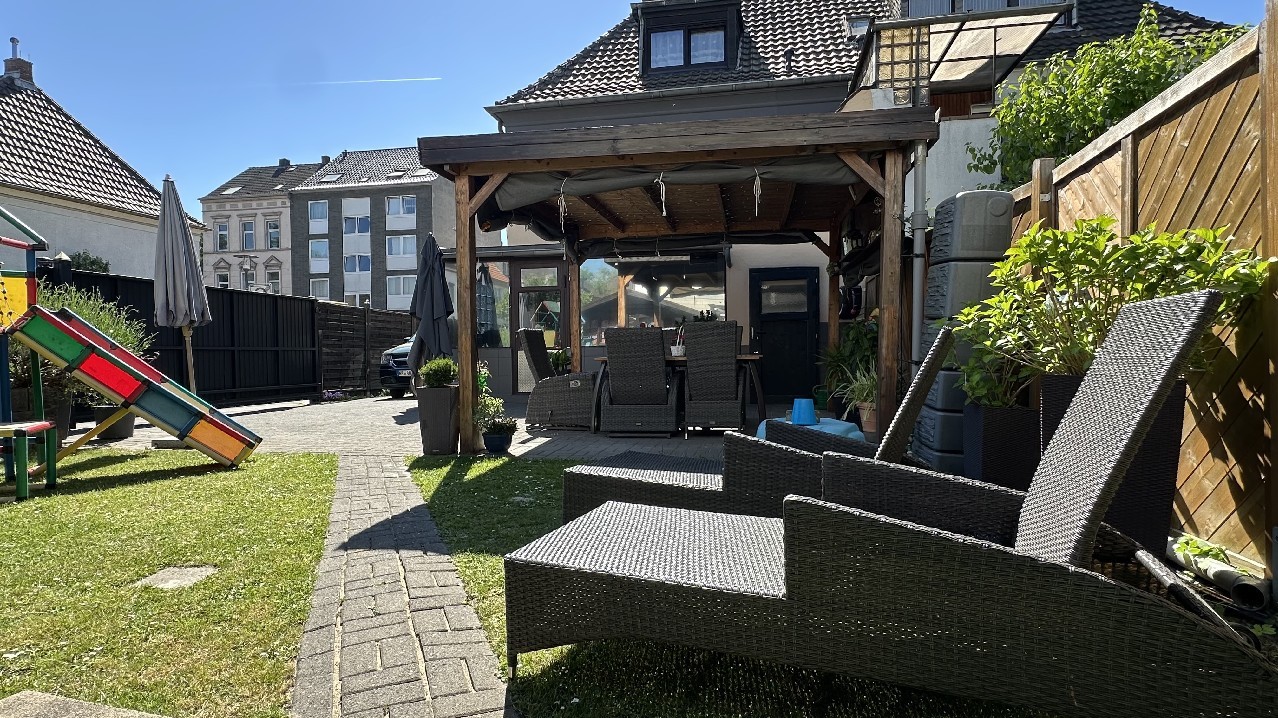 – Garten mit überdachter Terrasse, Gartenhaus, Solardusche etc.