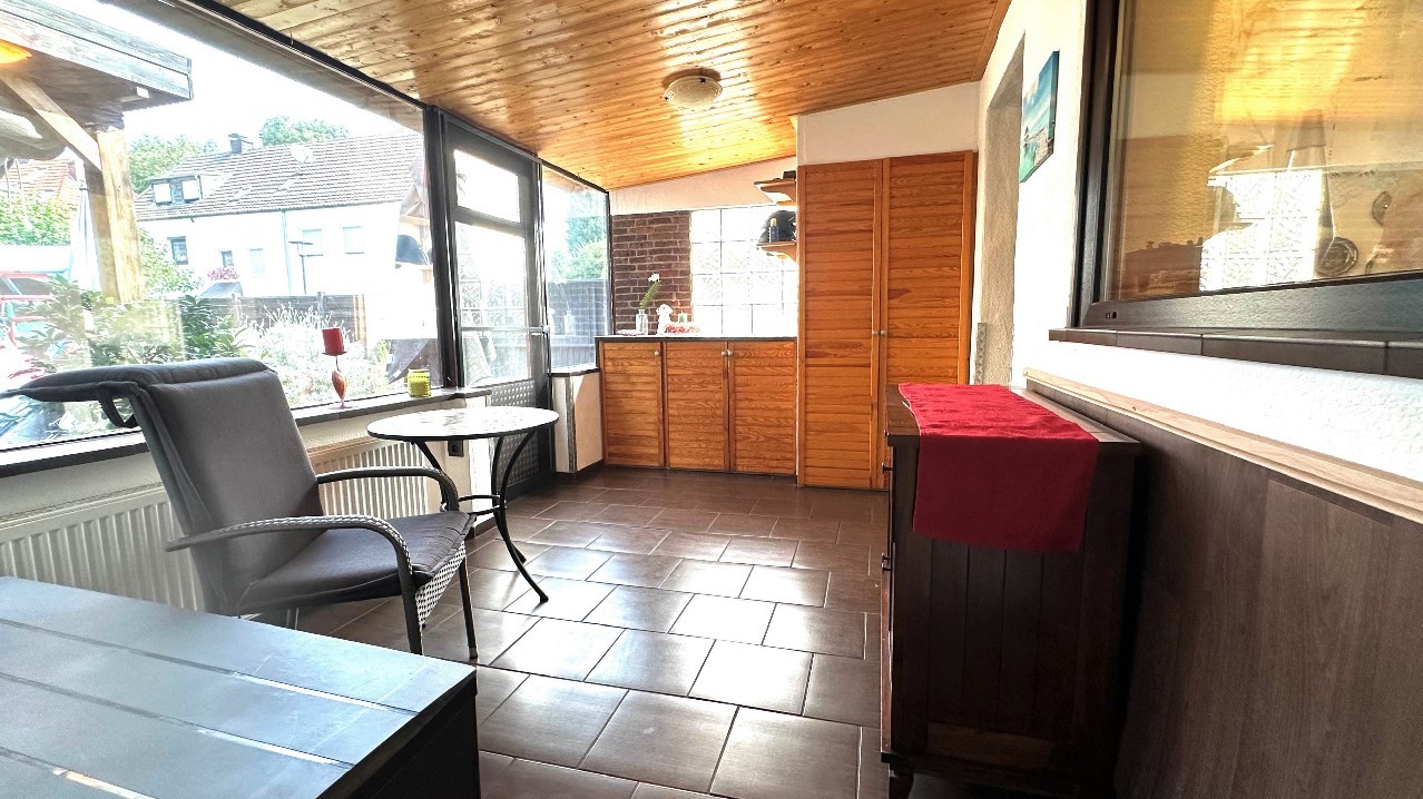 Am Ende des Hausflurs liegt das geräumige Wohnzimmer mit dem dahinter liegenden beheizten Anbau bzw. Wintergarten. Hier befindet sich das Gäste-WC, ein kleiner von außen begehbarem Abstellraum und der Ausgang zum Garten. Die große Terrasse ist teils überdacht und lässt Sie auch bei schlechtem Wetter Ihren Kaffee an der frischen Luft genießen. Hier fällt kein Grillabend ins Wasser.