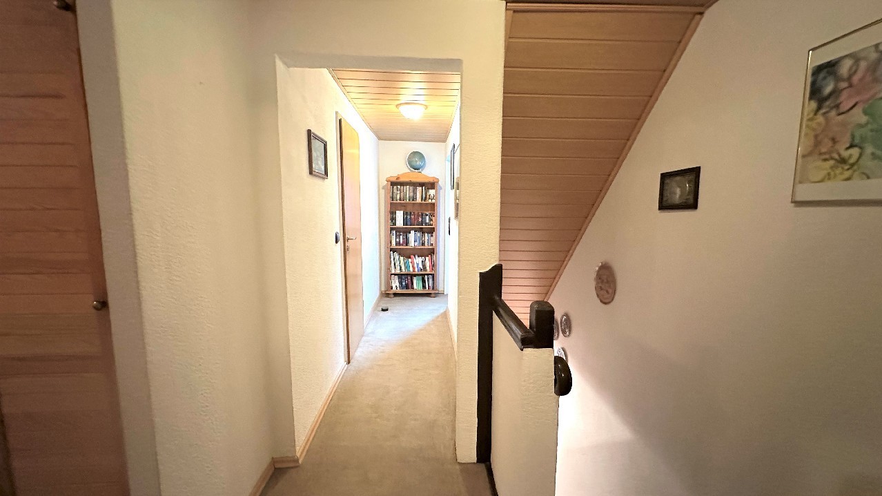 Im ersten Obergeschoss befindet sich das in freundlichem Weiß geflieste Tageslicht-Vollbad, zwei Schlafzimmer und der geräumige Flur mit einem kleinen Einbauschrank. Diese Etage ist mit Ausnahme des Badezimmers mit Teppichboden ausgelegt. Im Dachgeschoss befinden sich zwei weitere Zimmer und ein kleiner Waschraum mit Handwaschbecken. Das größere, zum Garten zugewandtem Zimmer wurde 2013 renoviert und mit einem neuen, pflegeleichten Fußboden in Holzoptik ausgelegt. Eine große Gaube verleiht diesem Raum einen schönen Wohnkomfort. Das früher als Jugendzimmer genutzte, kleinere Zimmer hat noch einen kleinen Abstellraum zwischen Wand und Dach. Über dem Dachgeschoss liegt noch ein Spitzboden.